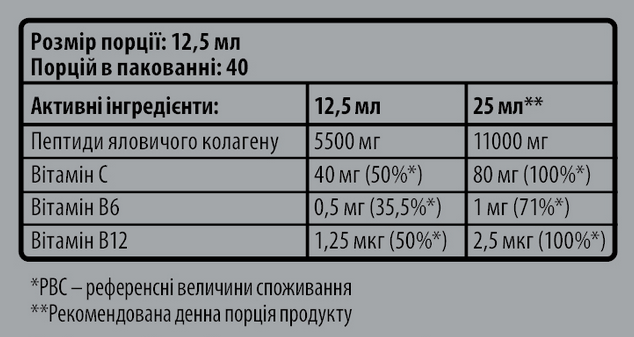 Склад: вода очищена, пептиди яловичого колагену І типу Peptolap Light, аскорбінова кислота (вітамін С), ароматизатор лісові ягоди, лимонна кислота, сукралоза, нізин Е234, піридоксину гідрохлорид (вітамін В6), ціанокобаламін (вітамін В12).