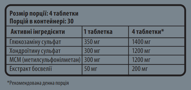 Інгредієнти: глюкзаміну сульфат, хондроїтину сульфат, МСМ (метилсульфонілметан), екстракт босвелії. Допоміжні речовини: МКЦ (мікрокристалічна целюлоза), кальцію стеарат.