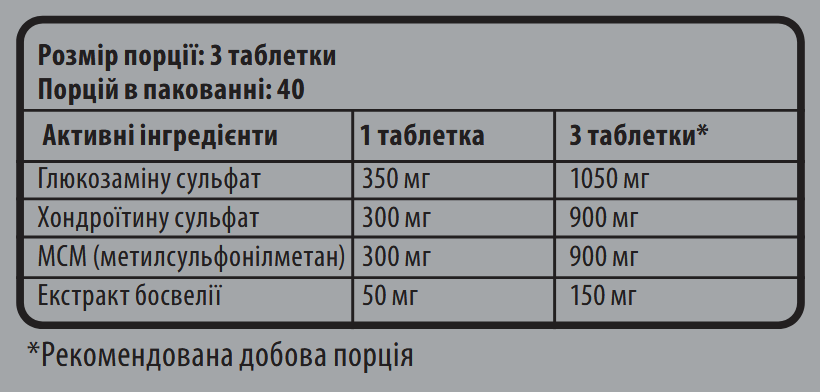 Склад: глюкозаміну сульфат, хондроїтину сульфат, МСМ (метилсульфонілметан), екстракт босвелії; допоміжні речовини: МКЦ (мікрокристалічна целюлоза), кальцію стеарат.