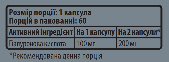 Склад: гіалуронова кислота, допоміжні речовини: діоксид кремнію, мікрокристалічна целюлоза; оболонка капсули: желатин; барвник: діоксид титану.