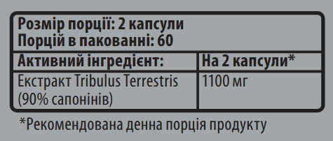 Склад: екстракт Tribulus terrestris (якірці сланкі) [90 % сапонінів], оболонка капсули: желатин; барвник: діоксид титану.